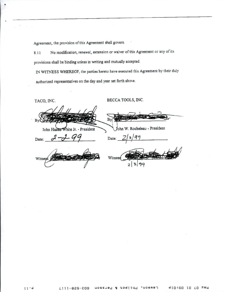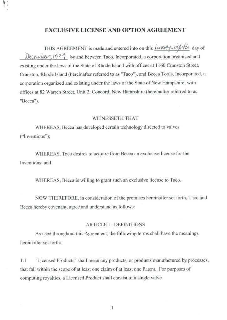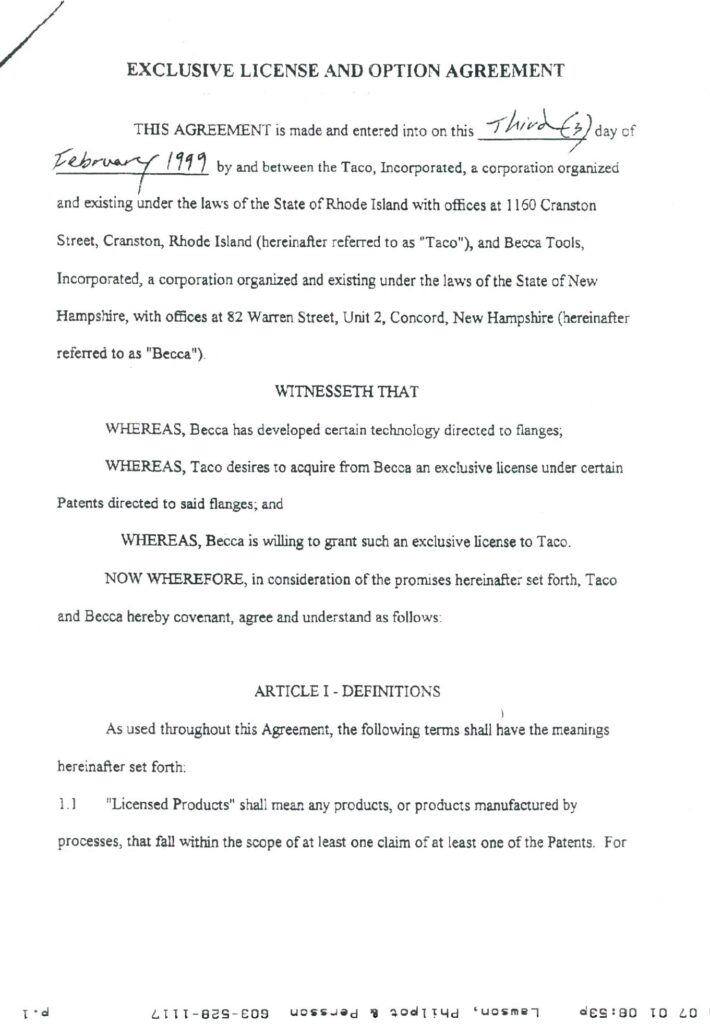 My first License Agreement with Taco, Inc., Cranston, RI, on February 3, 1999.